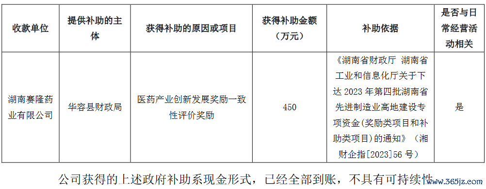 赛隆药业(002898)于12月14日发布公告称,赛隆药业集团股份有限公司(以下简称“公司”)全资子公司湖南赛隆药业有限公司于2023年12月11日收到华容县财政局拨付的2023年第四批湖南省先进制造业高地专项资金450万元,占公司2022年度经审计的归属于上市公司股东净利润绝对值的12.06%。具体情况如下: