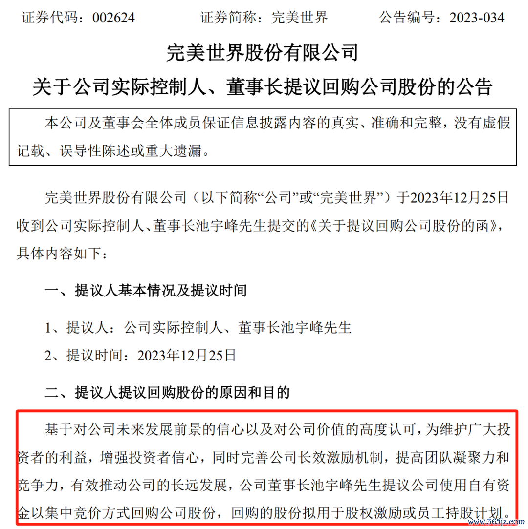 完美世界公告显示,基于对公司未来发展前景的信心以及对公司价值的高度认可,为维护广大投资者的利益,增强投资者信心,同时完善公司长效激励机制,提高团队凝聚力和竞争力,公司董事长池宇峰提议,公司使用自有资金回购公司股份,回购的股份拟用于股权激励或员工持股计划。