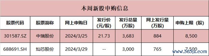 本周(3月25日—3月29日)将有两只新股开启申购配资官方网站,分别为创业板的中瑞股份、科创板的灿芯股份。