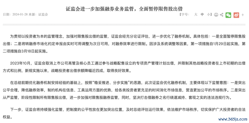 1月28日,证监会宣布全面暂停限售股出借。3月15日,证监会颁布《关于加强上市公司监管的意见(试行)》中明确提到禁止限售股转融通相关的规定:“禁止大股东、董事、高管参与以本公司股票为标的物的衍生品交易,禁止限售股转融通出借、限售股股东融券卖出,防范利用‘工具’绕道。”