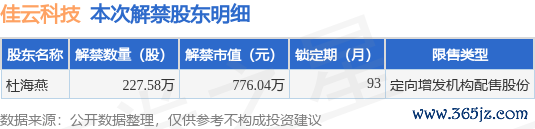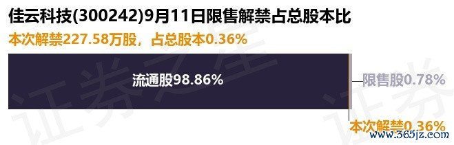 根据市场公开信息整理,佳云科技(300242)于9月11日将有227.58万股限售股份解禁上市,为公司定向增发机构配售股份,占公司总股本0.36%。本次解禁后,公司还有497.86万股限售股份,占总股本0.78%。具体如下图所示: